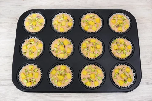 - Eine Muffinform ausfetten oder wie ich es immer mache, mit Papierförmchen bestücken. Die Förmchen zu rund ¾ mit Teig befüllen. Mit Mango Stückchen und Pistazien bestreuen.150 g Mango, 2 EL Pistazien