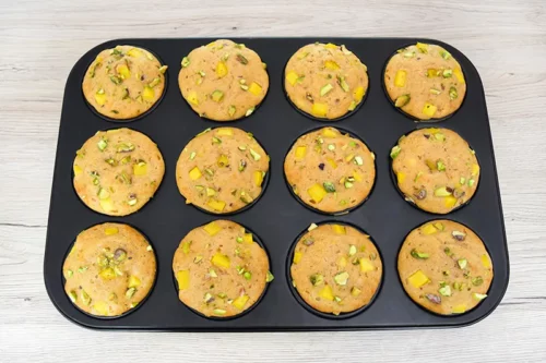 Gib die Mango Würfel kurz vor dem Servieren als Topping auf die Muffins, damit sie frisch und saftig bleiben.