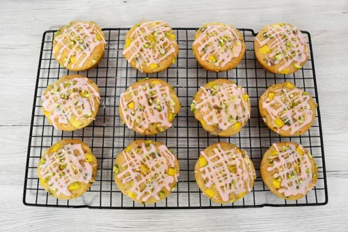 - In der Zwischenzeit für das abschließende Topping den Puderzucker mit etwas Aperol zu einem glatten Zuckerguss verrühren. Zu beachten ist die Farbe 😊. Sind die köstlichen Muffins ausgekühlt, diese auf ein Gitter stellen und mit dem pinken Zuckerguss nach Gusto dekorieren. Nach Belieben kannst du sie mit fein gehackten Pistazien bestreuen.50 g Puderzucker, 1-2 EL Aperol