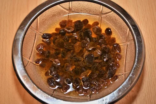 - In einer kleinen Schüssel die Sultaninen in Calvados einweichen. Der Alkohol wird natürlich nur zum Einweichen benötigt. 😀