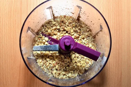 - Die Walnüsse in einem Zerkleinerer grob zerkleinern.