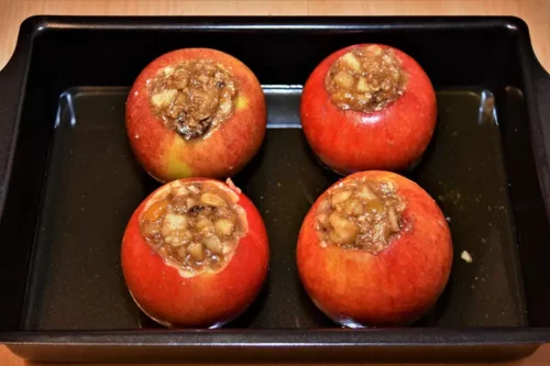 - Die Äpfel in eine Auflaufform setzen und mit der Mischung füllen.
