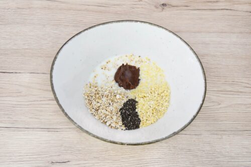 - Die Haferflocken, Chia Samen, Nutella und Hirseflocken in eine Schüssel geben und verrühren. Die Milch über die Flocken geben und vermischen.30 g Haferflocken, 20 g Hirseflocken, 1 TL Chia Samen, 1 TL Nutella, 100 ml Milch