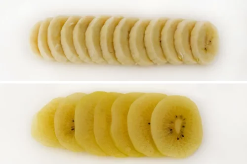 - Die Kiwi halbieren, schälen und in dünne Scheiben schneiden. Die Banane schälen, in Scheiben schneiden und mit etwas Zitronensaft beträufeln, damit sie nicht braun werden.½ Banane, ½ Kiwi, Spritzer Zitronensaft