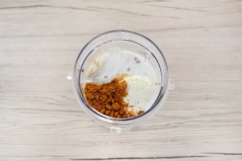 - In einen Mixer die Milch, Vanilleeis, Biscoff Aufstrich, Eiswürfel und die zerbröselten Kekse geben und alles gut durchmixen. Der Shake sollte eine cremige Konsistenz haben.250 ml Milch, 2-3 Kugeln Vanilleeis, 1 EL Biscoff-Aufstrich, Eiswürfel, 6 Biscoff Kekse