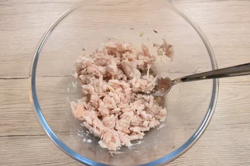 - Die Forellenfilets mit einer Gabel zerdrücken.125 g Forellenfilet