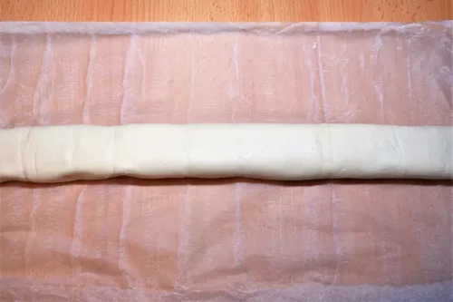 - Den Teig an der Längsseite von untenher aufrollen. Der Rand haftet und hält die Rolle zusammen.