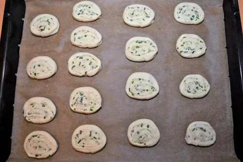 - Die Schnecken auf ein mit Backpapier ausgelegtes Backblech legen.
