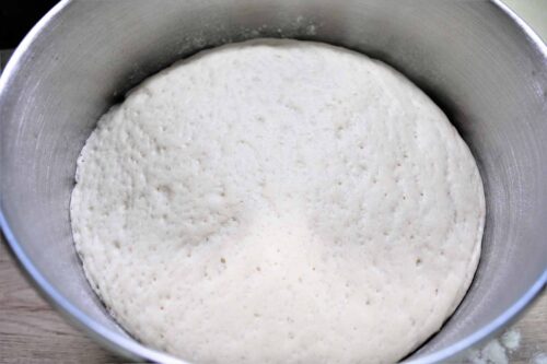 - Die Schüssel mit dem Teig abdecken und an einem warmen Ort mindestens 30 min gehen lassen, dabei sollte sich der Teig in etwa verdoppeln.