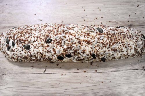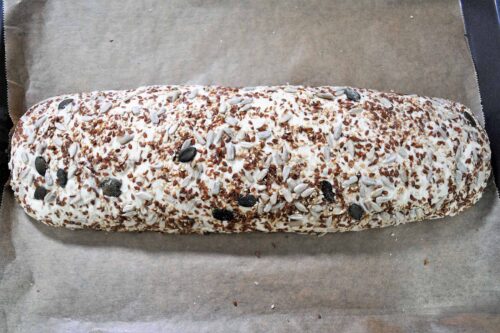 - Den Brotlaib rundum mit Körnern bedecken oder in den Körnern wälzen.