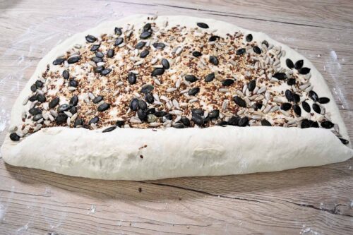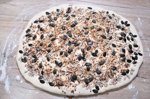 - Die Körnermischung auf dem Teig verteilen und leicht in den Teig drücken.