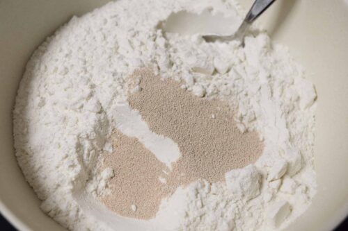 - Das Mehl durch ein Sieb in eine Schüssel einsieben und die Hefe untermischen.