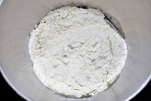 - Die Mehl Mischung auch in die Rührschüssel geben und alles in rund 10 min zu einem Teig verkneten; entweder durch die Küchenmaschine oder von Hand.