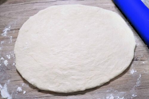 - Den Teig ausrollen, circa 30 cm Durchmesser, und mit etwas lauwarmen Wasser bestreichen.