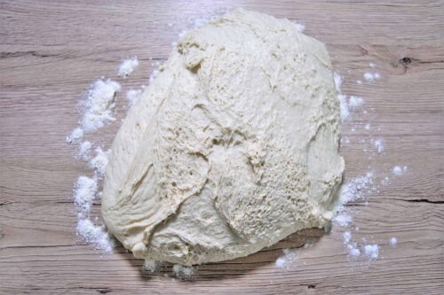 - Den Teig aus der Schüssel auf eine bemehlte Arbeitsfläche geben und noch einmal durchkneten.