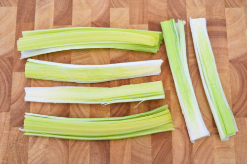 - Waschen Sie den Porree gründlich und schneiden Sie die Wurzeln ab. Unschöne Stellen, meist an den Spitzen, schneiden Sie ebenfalls ab. Teilen Sie die Lauchstange der Länge nach in der Mitte durch, so dass sie leicht auseinanderfällt. Trocknen Sie den Porree gut ab.2 Stangen Lauch