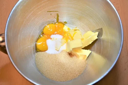 - Eigelb, Butter, Zucker und Vanillezucker cremig aufschlagen.250 g Butter, 5 Eigelb, 250 g Rohrohrzucker, 1 Packung Vanillezucker