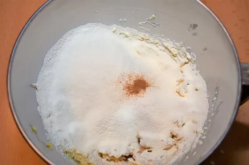 - Mehl, Salz und Zimt unterrühren.370 g Mehl, 1 Prise Salz, 1/2 TL Zimt