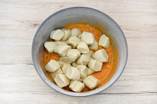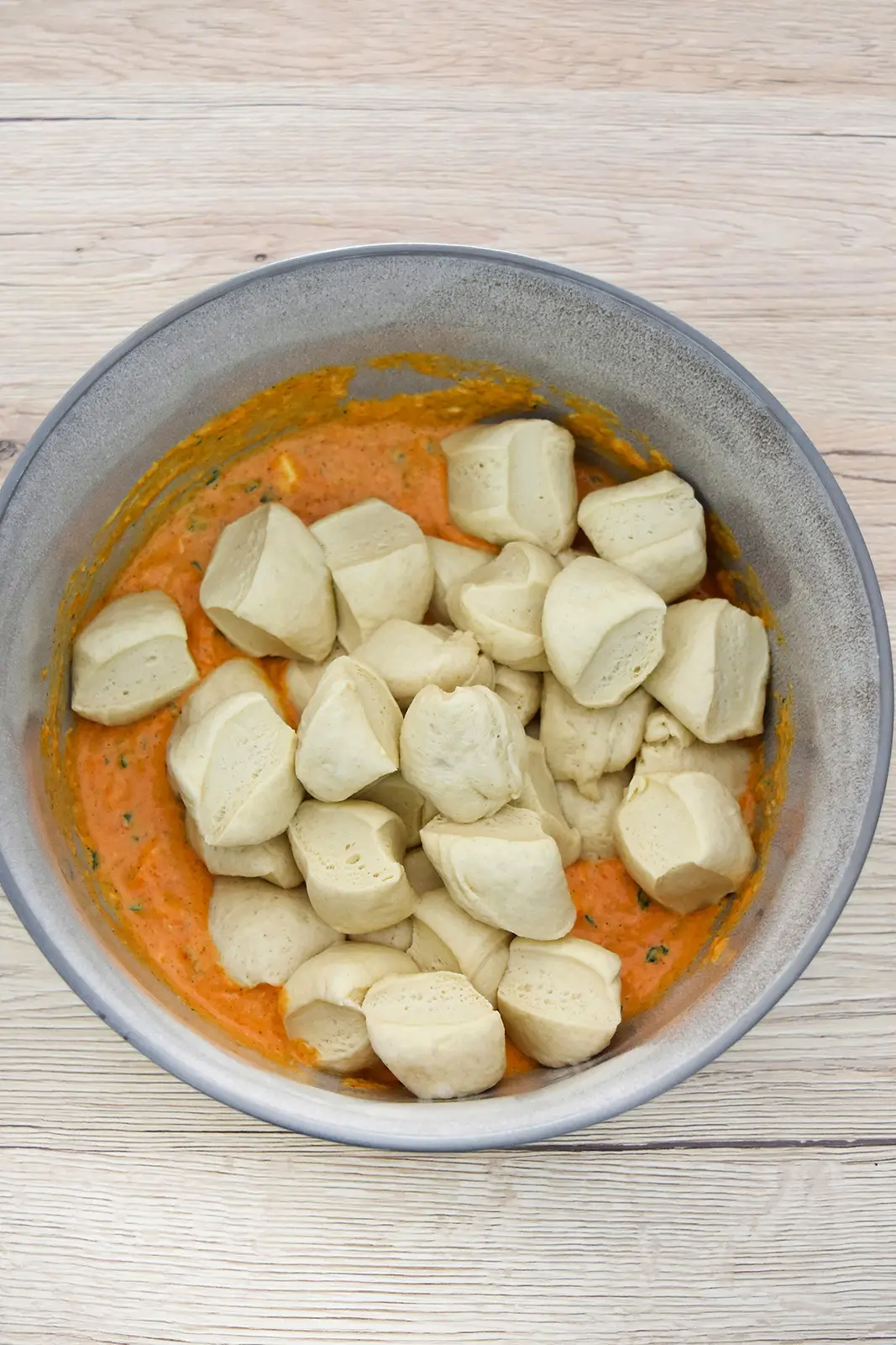 - Ob mit Ajvar oder selbstgemachter Paprikacreme ab hier geht es weiter. Die Sonntagsbrötchen öffnen, in die einzelnen Brötchen teilen und diese alle vierteln. Die Teigstücke in die Soße geben und unterheben.1 P Sonntagsbrötchen