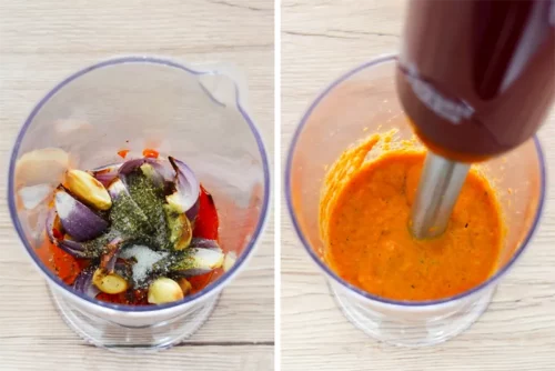 - Die Paprika schälen und mit den gerösteten Zwiebeln, den Knoblauchzehen, dem Olivenöl und den Gewürzen in ein schlankes hohes Gefäß geben und mit einem Stabmixer fein pürieren.3 Spitzpaprika, 1 Zwiebel, 6-10 Zehen Knoblauch, 1 Salz, 1 Prise Pfeffer, 4 EL Olivenöl, 1 TL italienische Kräuter