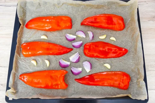 - Die Zwiebel schälen und in grobe Stücke schneiden. Die Knoblauchzehen schälen und ganz lassen. Die Paprika, waschen, trocknen, halbieren und entkernen. Alle Zutaten auf ein mit Backpapier ausgelegtes Backblech legen und dieses für 15 Minuten in den vorgeheizten Backofen geben und rösten. Wenn Du eine Chili verwenden möchtest, etwas Schärfe geht immer, solltest Du sie mit rösten.3 Spitzpaprika, 1 Zwiebel, 6-10 Zehen Knoblauch
