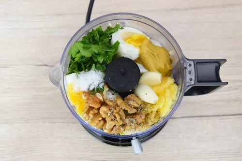 - Knoblauch, Petersilie, Walnüsse, Butter und Senf sowie die Gewürze zu den Eiern in den Mixer geben und fein pürieren. Lese hierzu bitte auch oben im Text.4 Eier, 30 g Butter, 2 Zehen Knoblauch, 20 g Walnüsse, 2 TL Senf, ½ TL Salz, Prise Pfeffer, 2 TL Zitronensaft, 2 EL Petersilie