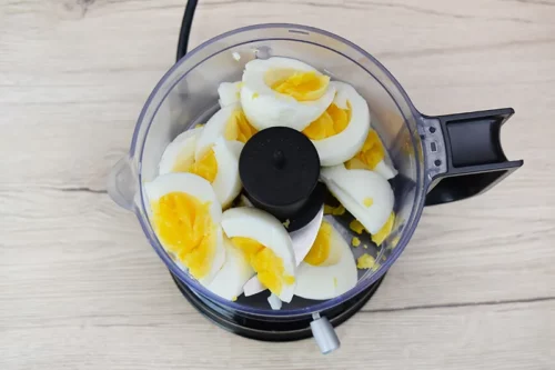 - Die gekochten Eier schälen, grob schneiden und in einen Mixer geben.4 Eier
