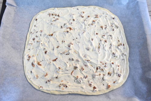 - Diese Creme gleichmäßig auf dem Teig verstreichen.
