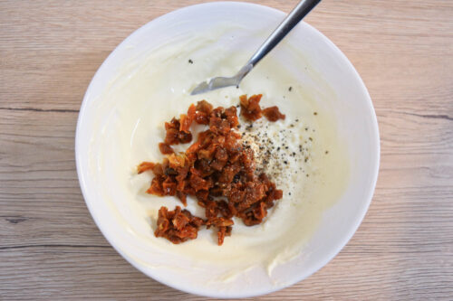 - In eine kleine Schüssel den Frischkäse und die Milch geben und mit einem Schneebesen zu einer glatten Creme verrühren. Die getrockneten Tomaten, Prise Salz und Pfeffer zugeben und alles vermischen.100 g Frischkäse, 3 EL Milch, 3-4 getrocknete Tomaten in Öl, Prise Salz, Prise Pfeffer