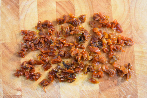 - Die getrockneten Tomaten sehr klein schneiden.3-4 getrocknete Tomaten in Öl