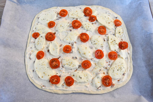 Sie servieren der Familie einen Flammkuchen mit einem soften Boden und dem vollen mediterranem Flair.