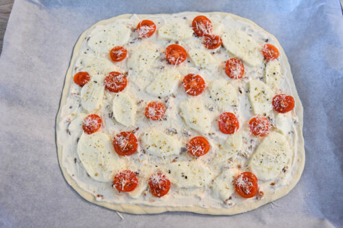 - Den geriebenen Parmesan über den Flammkuchen verteilen.1 EL Parmesan