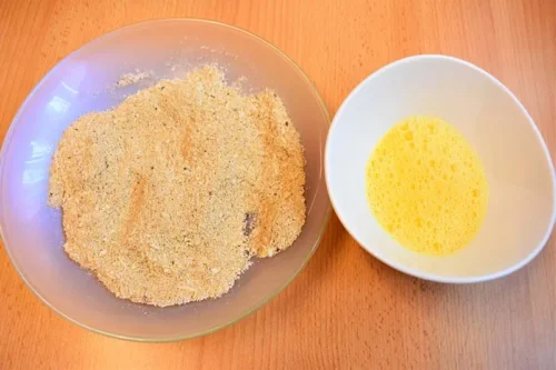 - In einem Teller das Ei verquirlen und in einem Teller das Paniermehl mit dem Parmesan gut vermischen.