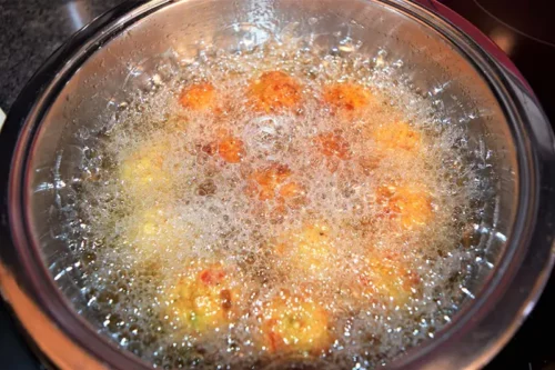 - In einem Topf das Öl zum Frittieren erhitzen und die Bällchen in 2-3 min bei mittlerer Hitze ausbacken. Auf ein Küchenkrepp legen und etwas abkühlen lassen.