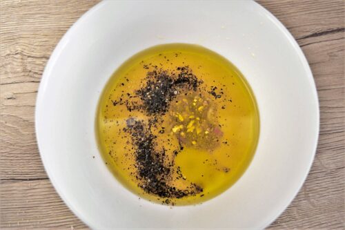 - Aus dem Öl und dem Essig sowie den Gewürzen eine Marinade anrühren.4 EL Olivenöl, 2 EL Walnussöl, 3 EL Walnussessig, 1 TL Pfeffer, 1 TL Salz, 1 Tl Gemüsebrühe