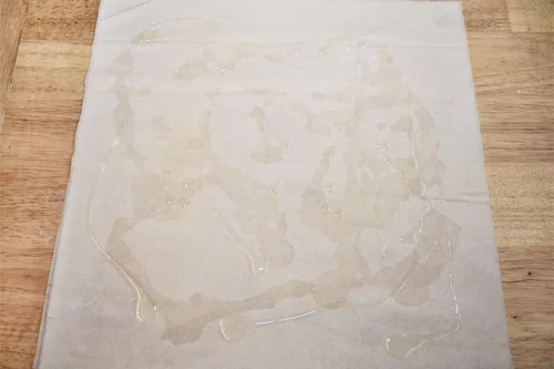 - Auf einer Arbeitsplatte ein Blatt Filoteig ausbreiten. Mit Öl beträufeln und das 2. Blatt darauflegen. Ebenfalls mit Öl beträufeln und das 3. Blatt auflegen, auch dieses beträufeln.1 P Filoteig, Öl für den Teig