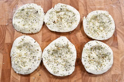 - Die Mozzarella Kugeln halbieren und eine kleine Vertiefung ausschneiden. Mit Gewürzsalz bestreuen.3 Mozzarella