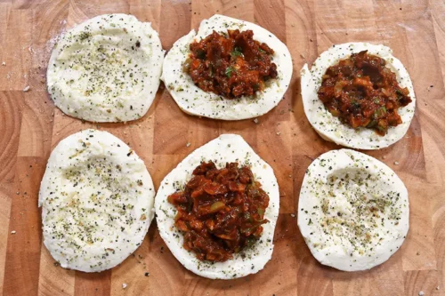 - In jede Vertiefung ein Drittel der Füllung geben und mit der zweiten Hälfte wieder abdecken. Mit etwas Gewürzsalz bestreuen.