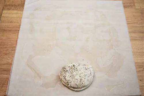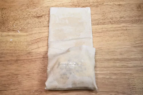 - Beide Seiten der Teigplatten über die Käsekugel schlagen und dann von unten nach oben aufrollen, ca. 2-mal nach oben drehen.