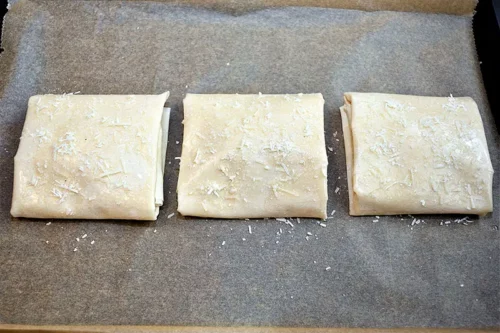 - Das Überraschungspaket auf ein mit Backpapier ausgelegtes Backblech legen, mit Öl einpinseln und mit Parmesan bestreuen. Paket 2 und 3 auf die gleiche Weise fertigen.3 TL Parmesan