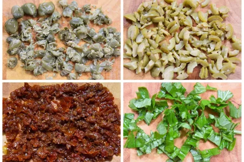 - Die getrockneten Tomaten, die Oliven und die Kapern sehr klein schneiden. Die Basilikumblätter fein hacken.3 getrocknete Tomaten in Öl, 6 grüne Oliven, 1 TL Kapern, 3 Blätter Basilikum