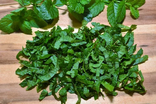 - Die Minze ebenfalls waschen und kleinschneiden.½ Bund frische Minze