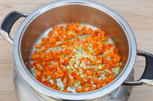 - In einen Topf das Öl mit Zwiebelwürfel, Möhre und Paprika geben und anbraten. Beginnen die Zwiebel glasig zu werden, den Knoblauch zugeben und mit anbraten.2 EL Olivenöl zum Anbraten