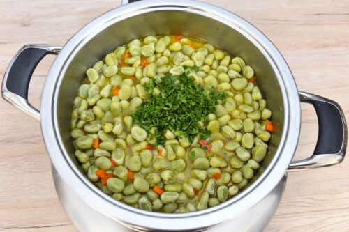 - Die geschmorten Dicken Bohnen abschmecken, anrichten und servieren.