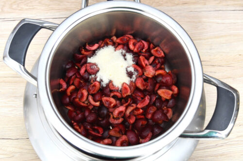 - Die Kirschen bei mittlerer Hitze (circa 10-15 Minuten) köcheln lassen, bis sie weich werden und der Zucker sich zu einem Sirup auflöst. Dabei gelegentlich umrühren.