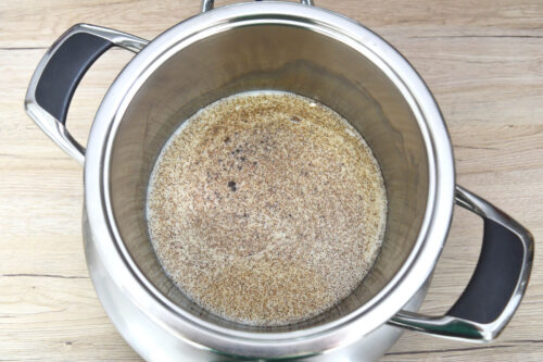 - Unter ständigem Rühren den Grießflammerie etwa 5-7 Minuten köcheln lassen, bis er eindickt und eine puddingartige Konsistenz bekommt. Durch den Bourbon Vanillezucker wird der Grieß dunkler, als Sie es vielleicht gewohnt sind. Da echte Vanille und nicht das künstliche Vanillin verwendet wird, ist dieser Zucker dunkel.