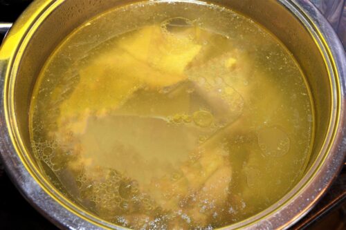 - Das Wasser und die Hähnchenteile in einen Topf geben und zum Kochen bringen. (Ich benutze für solche Vorgänge immer einen Schnellkochtopf, weil ich dadurch Zeit, Energie und Geld spare. Die Kochzeit beträgt im Schnellkochtopf 30 min, ohne 60 min).