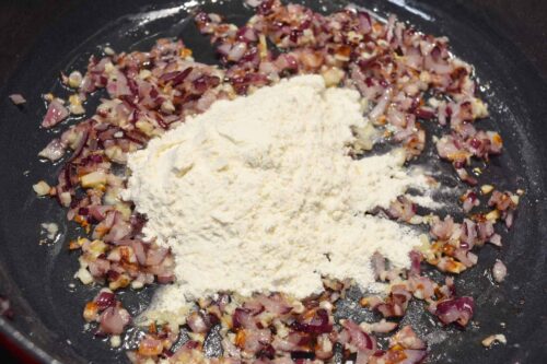 - Sind die Zwiebeln glasig, das Mehl über diese streuen und miteinander verrühren. Dabei bräunt das Mehl leicht an.