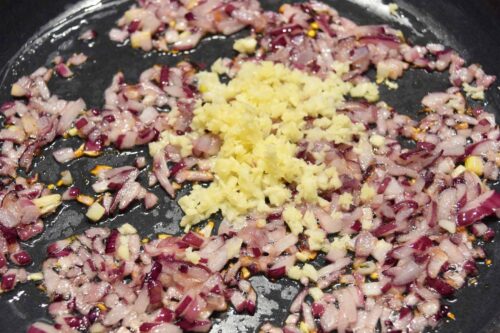 - Kurz bevor die Zwiebeln glasig sind, den Knoblauch zugeben und mit anbraten.