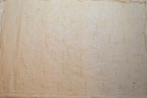 - Den Hefeteig auf ein mit Backpapier ausgelegtes Backblech ausrollen. Mit einer Gabel in den Teig kleine Löcher stechen.